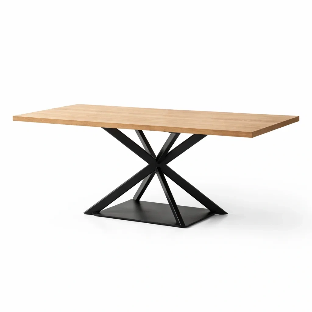 Il tavolo presenta un top in legno di rovere e una base in metallo nero verniciato.