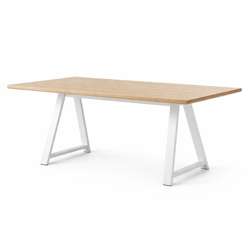 Il tavolo presenta un top in legno impiallacciato con una struttura in metallo verniciato bianco.